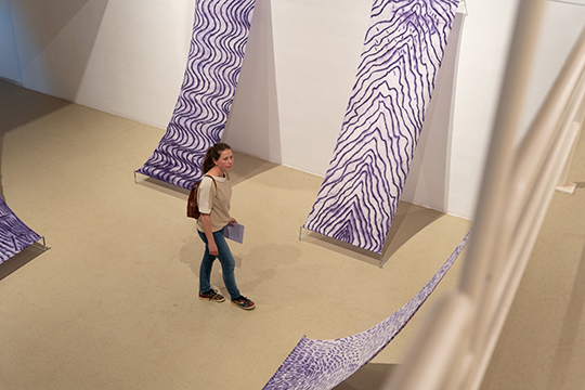 Prostorna instalacija u galeriji sastoji se od četiri velika vertikalna platna i osam ovalnih formi koje lebde u prostoru poput mobila i promatraju se obostrano. Svila tako postaje svojevrsna membrana između vidljivog i nevidljivog, a kroz dvodijelnu strukturu uspostavlja se ritam izložbe: apstraktno nasuprot figurativnom i elementarno nasuprot antropomorfnom. Platna simboliziraju osnovne elemente: vatru, vodu, zemlju i zrak, reducirane na ritmičke linijske strukture. Gustoća, isprekidanost i zakrivljenost linija stvaraju apstraktne vizualne ekvivalente prirodnih sila, na taj način izbjegavajući deskriptivnost u korist osjeta. Umjetnica stoga elemente prikazuje više kao stanja: dinamične forme koje prizivaju prirodu kao neprekidno kretanje i promjenu.